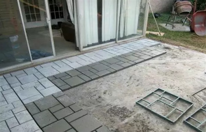 5、使用藝術(shù)地坪模具對(duì)地坪面層進(jìn)行紋理處理。藝術(shù)地坪模具應(yīng)配套使用,首先確定好紋理的分布方向,選好第一塊模具放置的位置和角度,然后其它的模具依次緊貼第一塊模具放置。彩色混凝土藝術(shù)地坪壓模采用人工壓模,壓模應(yīng)由技術(shù)較好的人員進(jìn)行作業(yè)以保證壓紋深度一致和模具放置的準(zhǔn)確性。