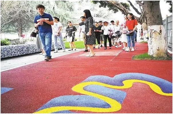 作為園林景觀的一個有機組成部分,園林鋪地彩色壓模地坪主要通過對園路、空地、廣場等進行不同形式的印象組合,貫穿游人游覽過程的始終,在營造空間的整體形象上具有極為重要的影響。鋪裝后的園林道路,在園林環境中不僅具有分割空間、組織路線和引導視線的作用,空地和廣場則為人們提供了良好的休息和活動場所,同時還直接創造出了優美的地面景觀,給人以美的享受,增強了園林藝術的效果。