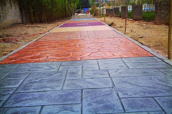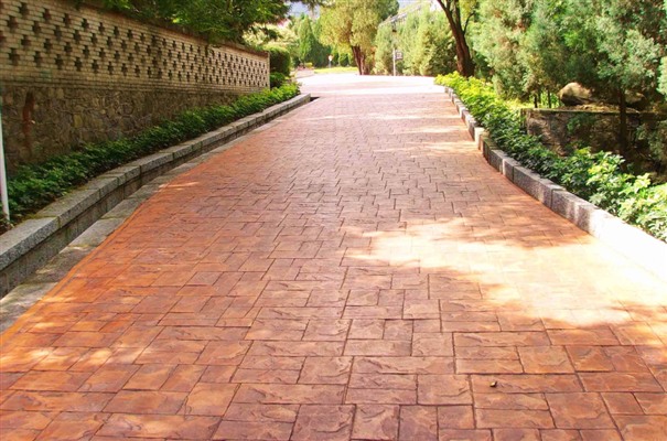 5、進行壓印,使模具陷入混凝土中,陷入的深度與模具和施工人員使用的力度有關(guān)。其實,施工經(jīng)驗豐富的技術(shù)工人能使壓印的紋理均勻、深淺一致,表面的紋理凹凸有致,作用逼真。