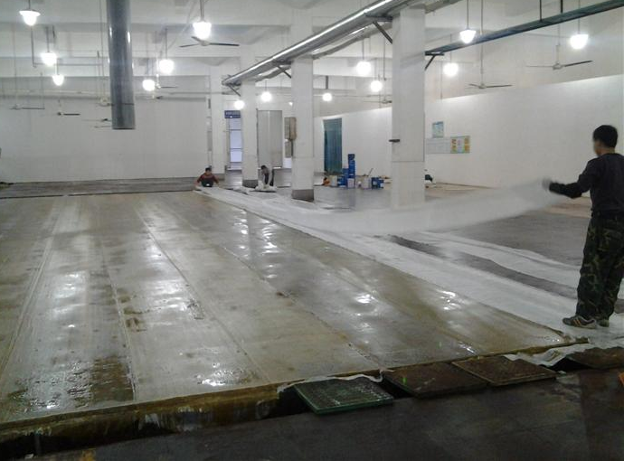 粘貼玻璃纖維布兩層:使用乙烯基地坪清漆:固化劑=100:1.2攪拌均勻后用于粘貼玻璃纖維布,要求粘貼的玻纖布平整,不起鼓,樹脂漆均勻,無氣泡等現象。