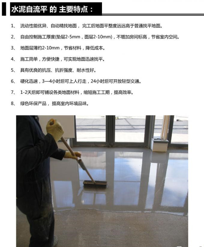 水泥自流平是一種科技含量高、技術環(huán)節(jié)復雜的高新綠色產品.是由多種活性成分組成的干混型粉狀材料,自流平是一種地面施工技術,它是由多種材料同水混合而成的液態(tài)物質,倒入地面后,這種物質可根據地面的高低不樣順勢流動,對地面進行自動找平,并能很快干燥,固化后的地面會形成光滑、平整、無縫的新基層。