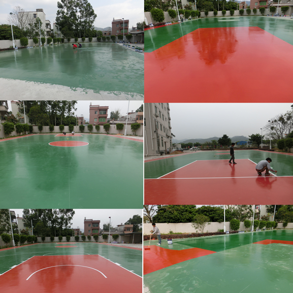 A、籃球場:分三道噴涂,第一、二道加15%(TB-205重量計算)專用砂,每道用量約為0.15kg,第三道不加砂(用量約為0.1kg),加砂時,應(yīng)先將A組份與專用砂攪拌均勻,再加入B組份攪拌均勻,再加水稀釋;三秒禁區(qū)應(yīng)做三道加砂的,一道不加砂(共四道)
